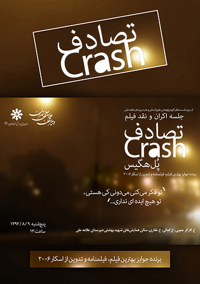 از سری نشستهای گروه پژوهشی علوم انسانی و هنر دبیرستان علامهحلی تهران تصادف CRASH پُل هگیس برنده جوایز بهترین فیلم، فیلمنامه و تدوین از اسکار 2006 پنجشنبه 9 آبان 1392 مطالب مرتبط: پوستر نقد فیلم تصادف Crashپوستر جلسه نقد فیلم سینمایی «نیمروز»پوستر نقد فیلم «اتوبوس شب»پوستر اکران فیلم محمد رسول اللهپوستر اکران فیلمهای برگزیده جشنواره عمارپوستر مستند کوتاهپوستر نقد فیلم «گاو خشمگین»